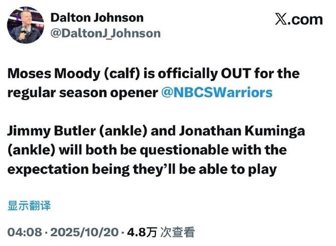 除此之外,勇士方面主帅科尔透露此前遭遇脚踝伤势困扰的巴特勒与库明加两位主力,科尔表示两人均是已经升级为大概率出战:“我预计两人都会出战。”至于穆迪因为小腿伤势缺席。